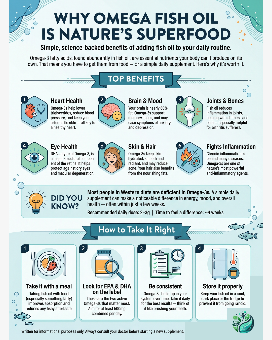 Omega-3s build up in your system over time. Take it daily for the best results — think of it like brushing your teeth.